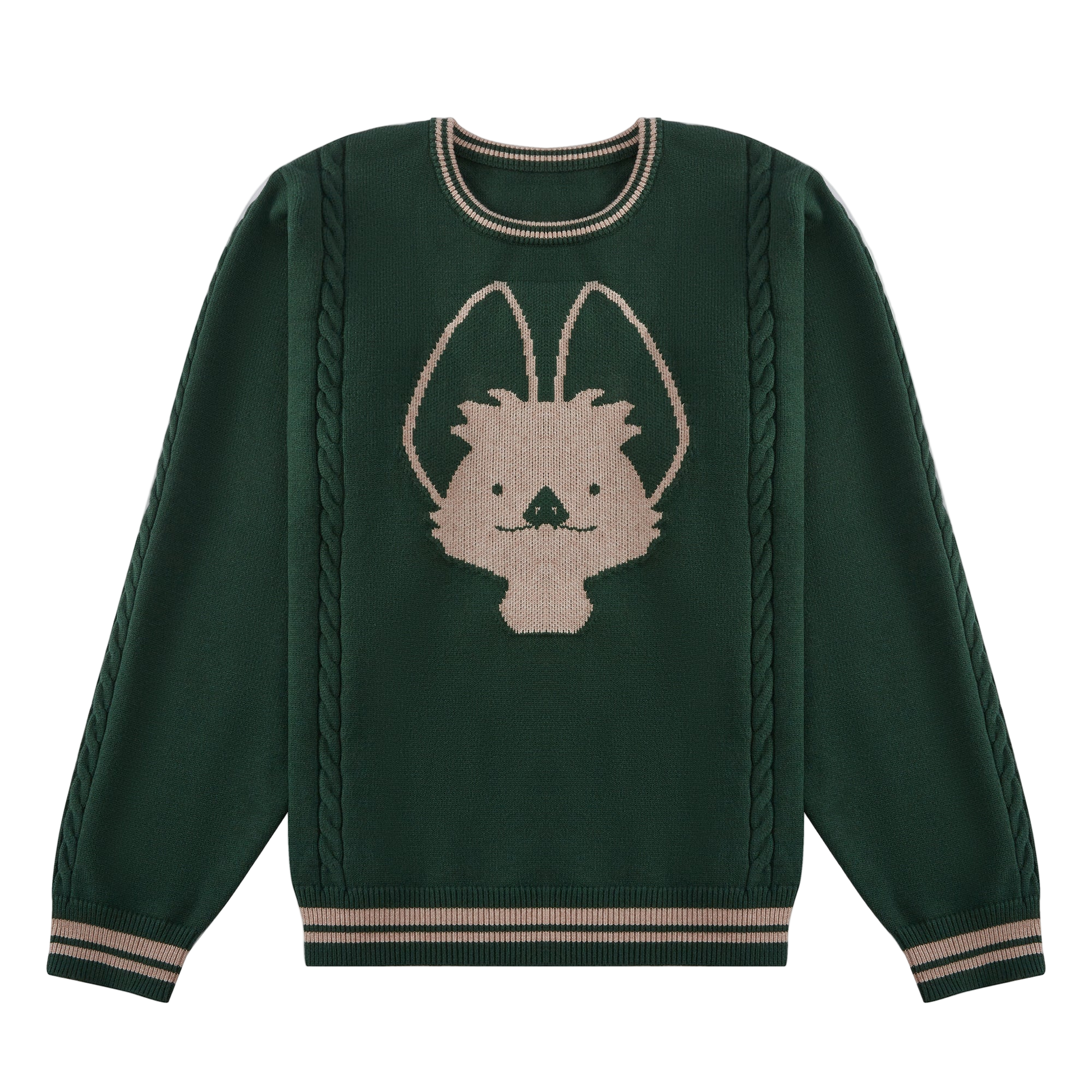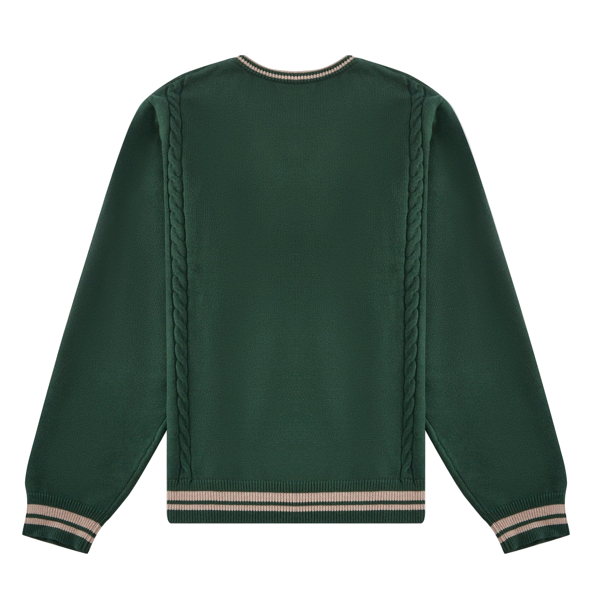 • Cable knit panel running vertically along both sides of body (front + back) + arms
