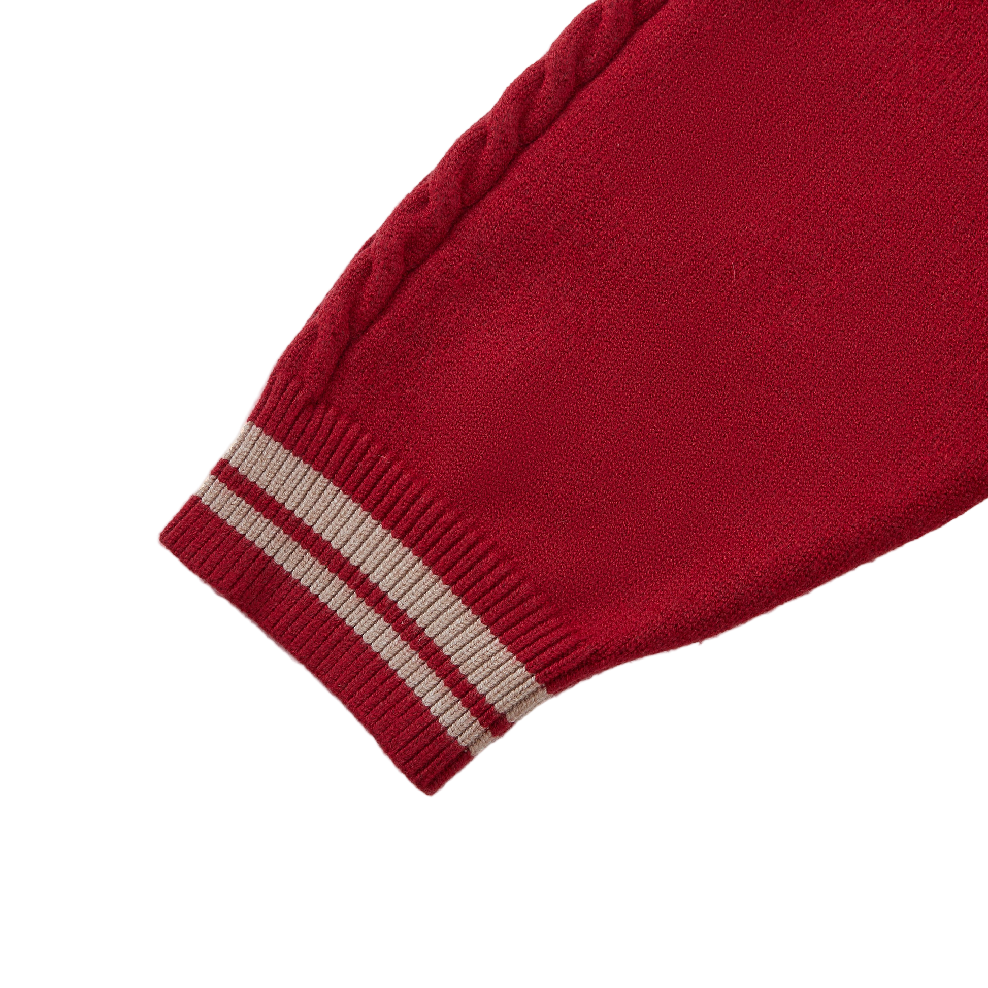 • Cable knit panel running vertically along both sides of body (front + back) + arms